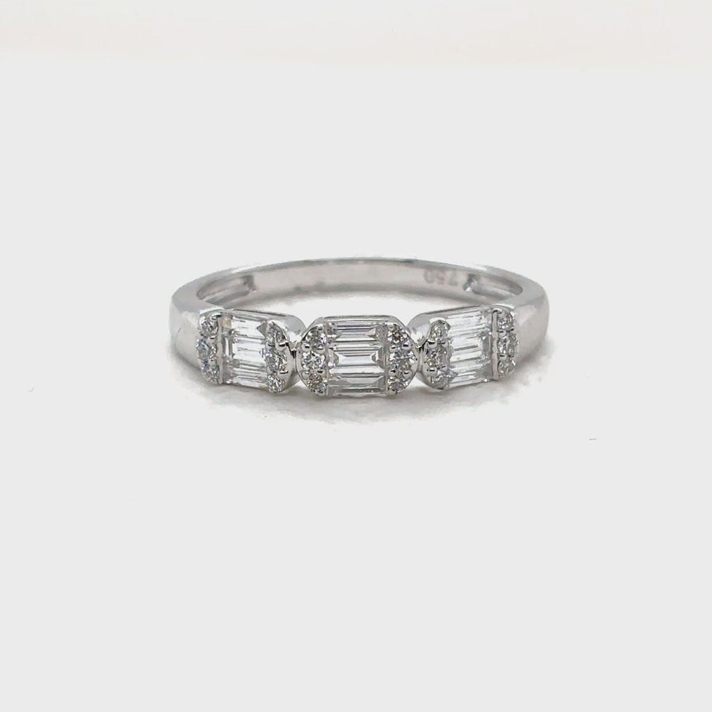 This 18k white gold band sparkles with a mix of diamonds—eighteen round stones totaling 0.10ctw and nine baguette-shaped gems adding up to 0.26ctw—making it a dazzling treat for your finger!